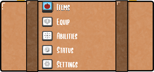 inventory management system created, with basic healing items and equippable armor in different menus. styled like a suitcase, when an option is picked the top swings open revealing the menu below